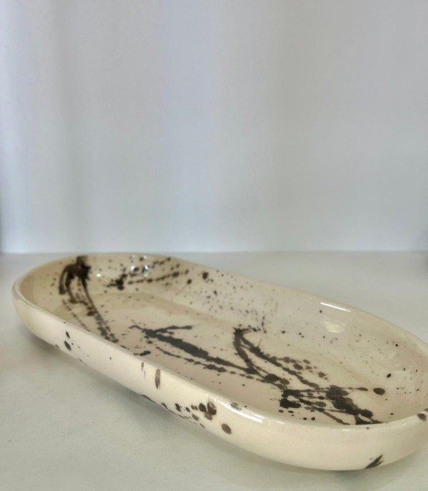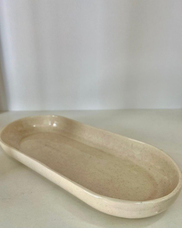 Bandeja de cerámica hecha a mano, ideal para acompañar la mesa o decorar distintos rincones del hogar. Su diseño alargado y acabado esmaltado la hacen versátil y funcional: perfecta para servir aperitivos, colocar joyas, velas o pequeños objetos decorativos.