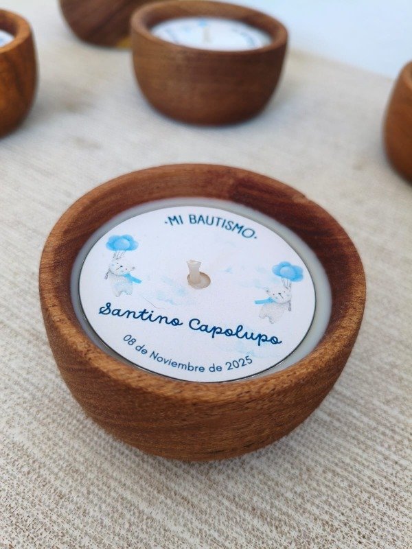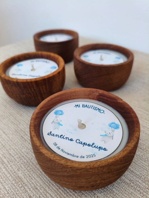 Un detalle único y natural para regalar. Cada souvenir incluye una vela de soja artesanal en cuenco de madera, de 8 cm de diámetro, elaborada con cera vegetal 100% natural y fragancias suaves que aportan calidez y armonía.